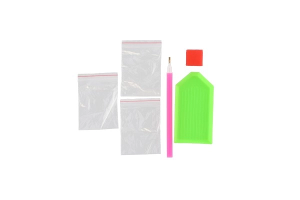- Πλήρης εξοπλισμός: καμβάς με υπόμνημα, στυλό εφαρμογής, δίσκος, κερί, σετ χρωματιστών πετραδιών.