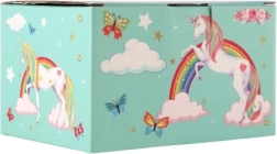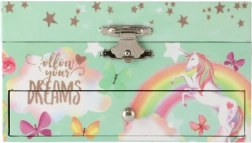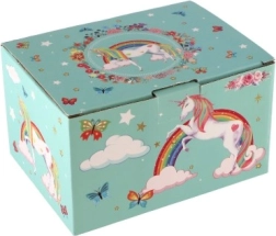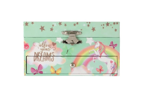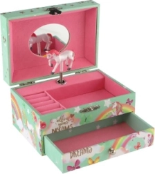 Μαγική μουσική κοσμηματοθήκη με θέμα τον μονόκερο σε παστέλ πράσινο χρώμα που θα ενθουσιάσει κάθε μικρή καλοντυμένη. Με το κούρδισμα του κλειδιού η φιγούρα του μονόκερου αρχίζει να περιστρέφεται και ακούγεται μια απαλή μελωδία. Στο εσωτερικό θα βρείτε καθρεφτάκι, πρακτικές θήκες και ένα χρήσιμο συρτάρι για μικρούς θησαυρούς. Η ανθεκτική χάρτινη κατασκευή, τα μεταλλικά στοιχεία και οι γοητευτικές εικονογραφήσεις από ουράνια τόξα, αστεράκια και πεταλούδες ολοκληρώνουν υπέροχα το παιδικό δωμάτιο.