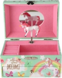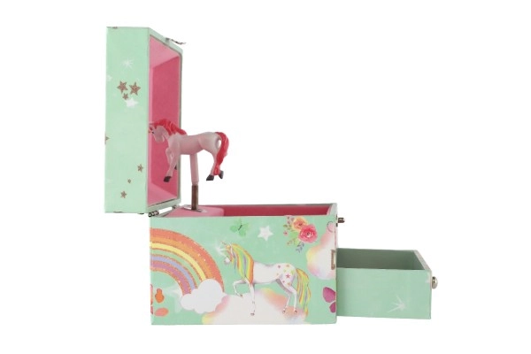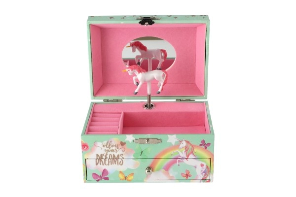 Αυτή η κομψή μουσική κοσμηματοθήκη με μονόκερο είναι ιδανική για την αποθήκευση δαχτυλιδιών, σκουλαρικιών και μικρών μυστικών. Με το άνοιγμα του καπακιού με καθρεφτάκι και το κούρδισμα του κλειδιού, ο λευκορόδινος μονόκερος αρχίζει να περιστρέφεται και ακούγεται απαλή μουσική. Το εσωτερικό προσφέρει διαχωρισμένο χώρο για κοσμήματα, ενώ το κάτω συρτάρι χωράει επιπλέον πολύτιμα αντικείμενα.
